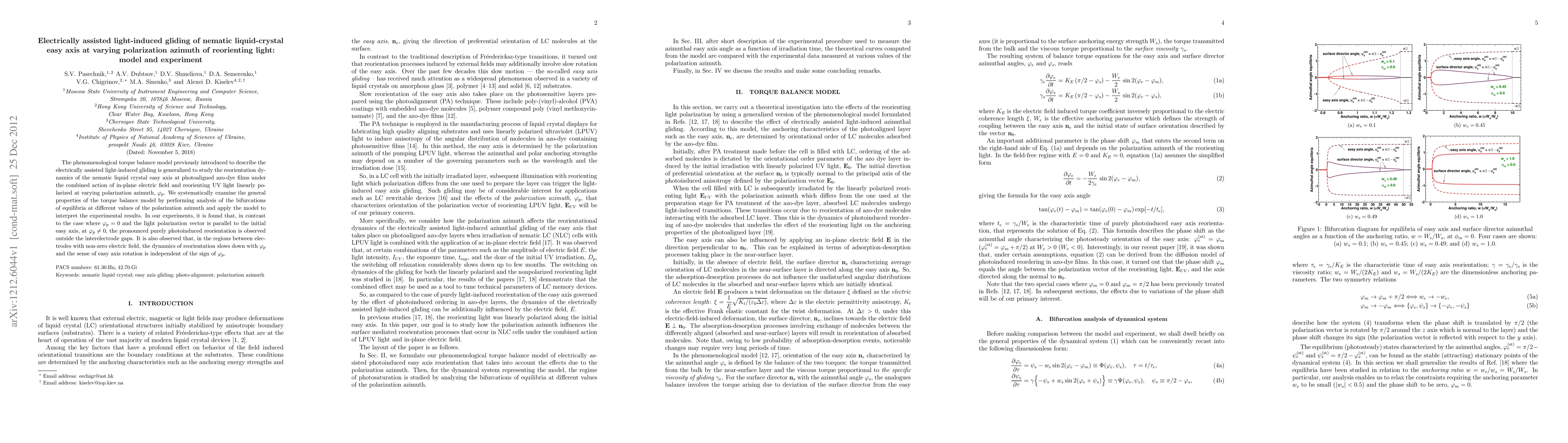 The phenomenological torque balance model previously introduced to describe the electrically assisted light-induced gliding is generalized to study the reorientation dynamics of the nematic liquid crystal easy axis at photoaligned azo-dye films under the combined action of in-plane electric field and reorienting UV light linearly polarized at varying polarization azimuth, $\varphi_p$. We systematically examine the general properties of the torque balance model by performing analysis of the bifurcations of equilibria at different values of the polarization azimuth and apply the model to interpret the experimental results. In our experiments, it is found that, in contrast to the case where $\varphi_p=0$ and the light polarization vector is parallel to the initial easy axis, at $\varphi_p\ne 0$, the pronounced purely photoinduced reorientation occurs outside the interelectrode gaps. It is also observed that, in the regions between electrodes with non-zero electric field, the dynamics of reorientation slows down with $\varphi_p$ and the sense of easy axis rotation is independent of the sign of $\varphi_p$.