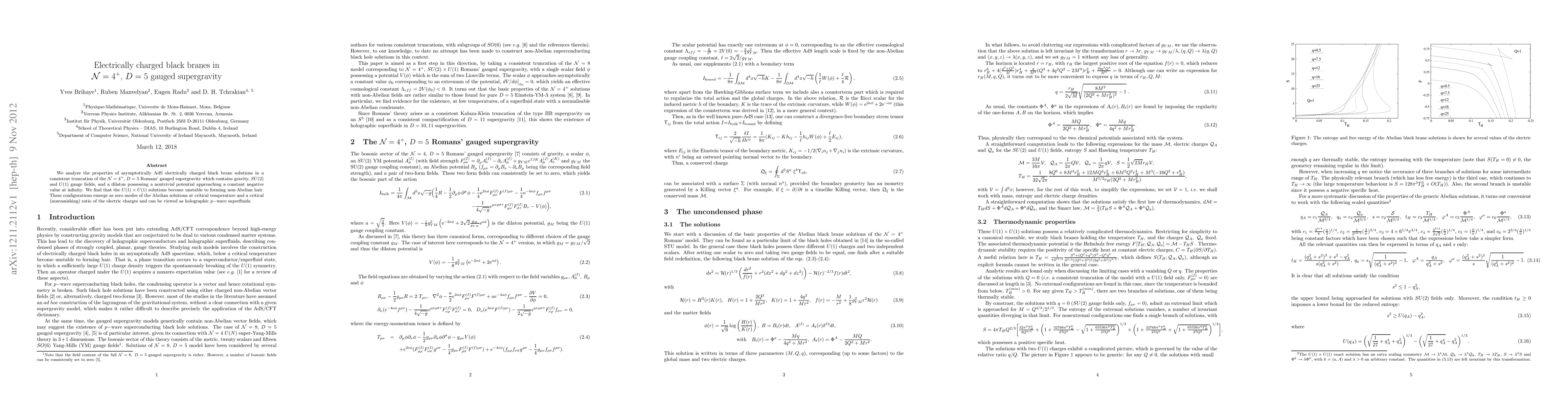This paper investigates electrically charged black brane solutions in N=4^+, D=5 gauged supergravity, revealing that U(1)×U(1) solutions become unstable to non-Abelian hair formation at a critical temperature and charge ratio, resembling holographic p-wave superfluids.