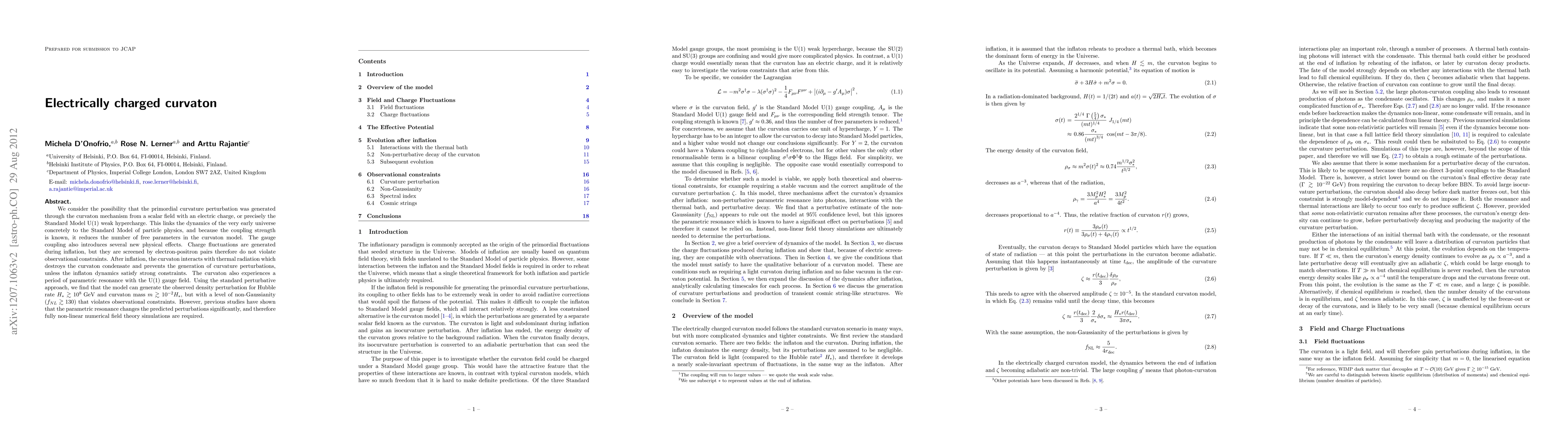 We consider the possibility that the primordial curvature perturbation was generated through the curvaton mechanism from a scalar field with an electric charge, or precisely the Standard Model U(1) weak hypercharge. This links the dynamics of the very early universe concretely to the Standard Model of particle physics, and because the coupling strength is known, it reduces the number of free parameters in the curvaton model. The gauge coupling also introduces several new physical effects. Charge fluctuations are generated during inflation, but they are screened by electron-positron pairs therefore do not violate observational constraints. After inflation, the curvaton interacts with thermal radiation which destroys the curvaton condensate and prevents the generation of curvature perturbations, unless the inflaton dynamics satisfy strong constraints. The curvaton also experiences a period of parametric resonance with the U(1) gauge field. Using the standard perturbative approach, we find that the model can generate the observed density perturbation for Hubble rate H_* > 10^8 GeV and curvaton mass m > 0.01 H_*, but with a level of non-Gaussianity (f_NL > 130) that violates observational constraints. However, previous studies have shown that the parametric resonance changes the predicted perturbations significantly, and therefore fully non-linear numerical field theory simulations are required.