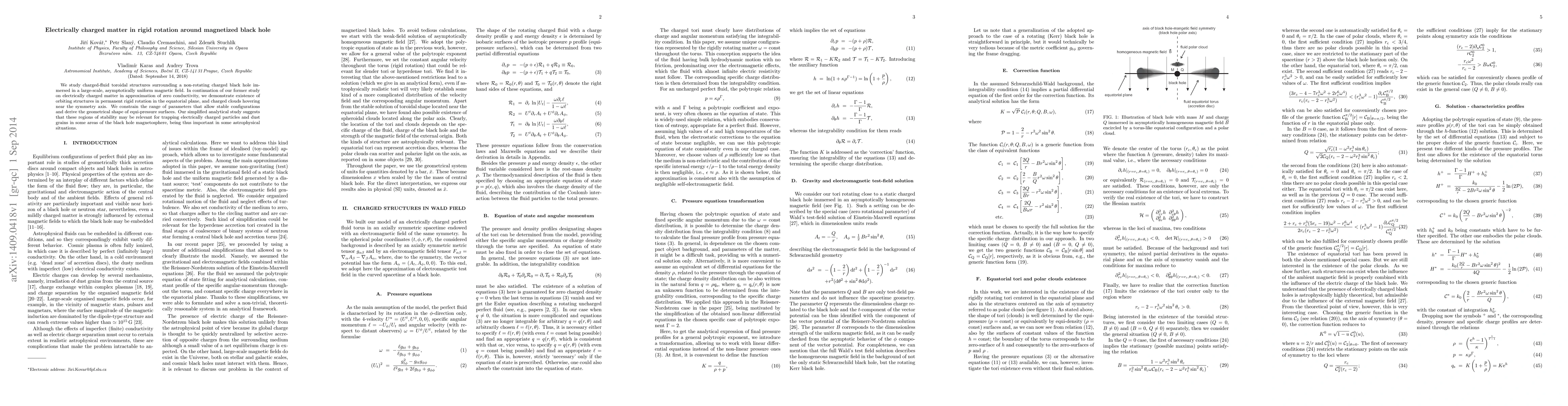 We study charged-fluid toroidal structures surrounding a non-rotating charged black hole immersed in a large-scale, asymptotically uniform magnetic field. In continuation of our former study on electrically charged matter in approximation of zero conductivity, we demonstrate existence of orbiting structures in permanent rigid rotation in the equatorial plane, and charged clouds hovering near the symmetry axis. We constrain the range of parameters that allow stable configurations and derive the geometrical shape of equi-pressure surfaces. Our simplified analytical study suggests that these regions of stability may be relevant for trapping electrically charged particles and dust grains in some areas of the black hole magnetosphere, being thus important in some astrophysical situations.