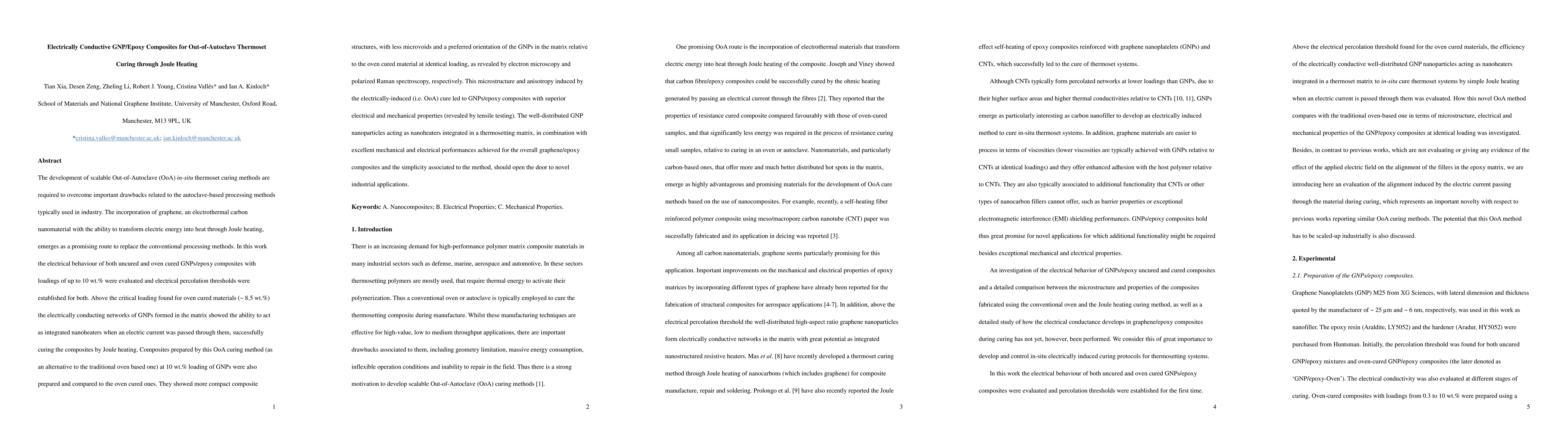 This research develops scalable out-of-autoclave thermoset curing methods using graphene nanoplatelet (GNP)/epoxy composites cured via Joule heating. The study finds that GNPs at 10 wt% loading create electrically conductive networks that facilitate efficient curing, resulting in composites with superior electrical and mechanical properties compared to traditional oven-cured composites.