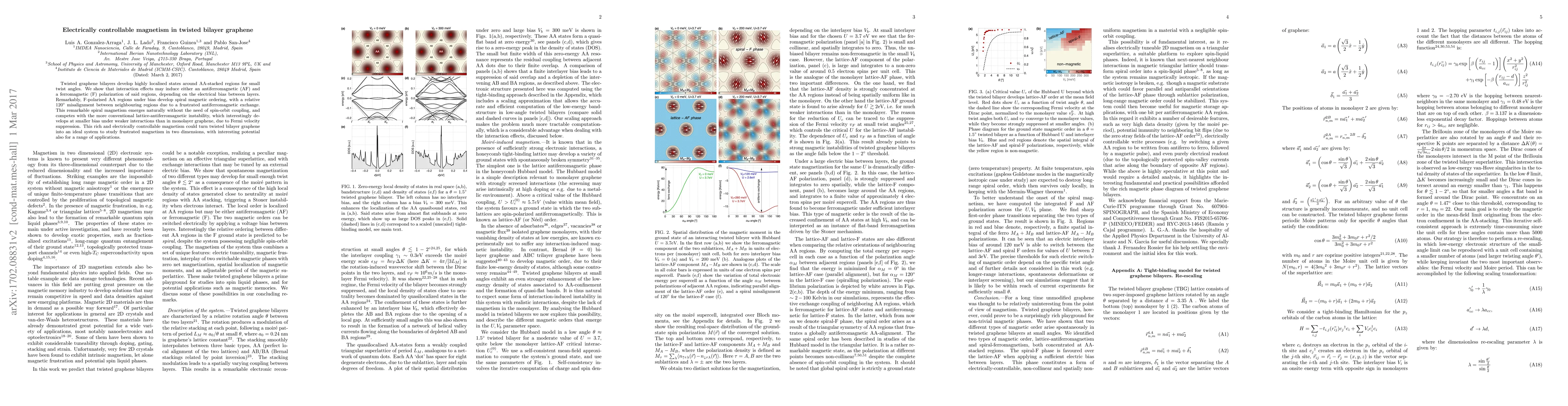 This paper demonstrates that twisted bilayer graphene exhibits electrically controllable magnetism, where the polarization and magnetic ordering of localized states can be manipulated by electrical bias, leading to either antiferromagnetic or ferromagnetic states, and even spiral magnetic ordering without spin-orbit coupling. This unique magnetism holds potential for studying frustrated magnetism and applications in two-dimensional systems.