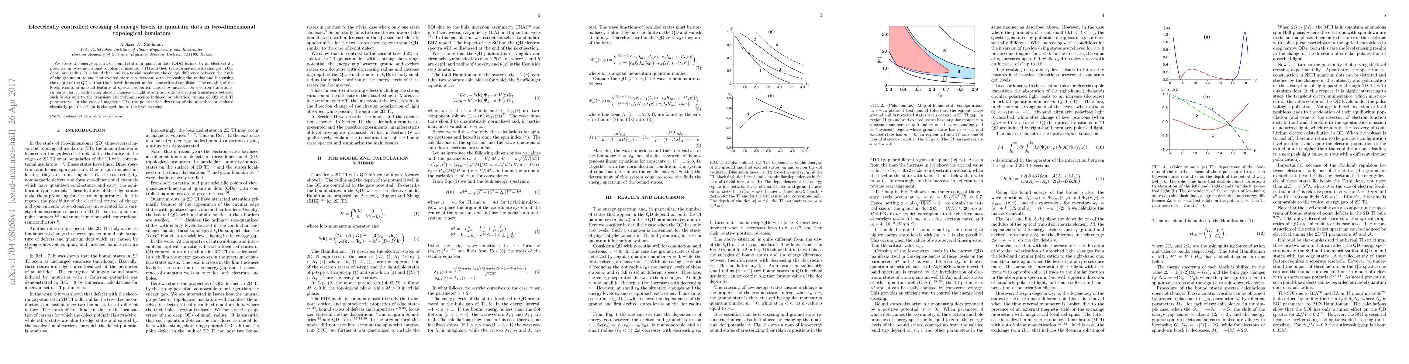 This paper investigates the energy spectra of quantum dots in two-dimensional topological insulators, revealing that under specific conditions, the energy levels can cross, leading to unique optical properties and transient electroluminescence. The level crossing alters light absorption and induces electroluminescence, with additional effects on the polarization of emitted light in magnetic topological insulators.