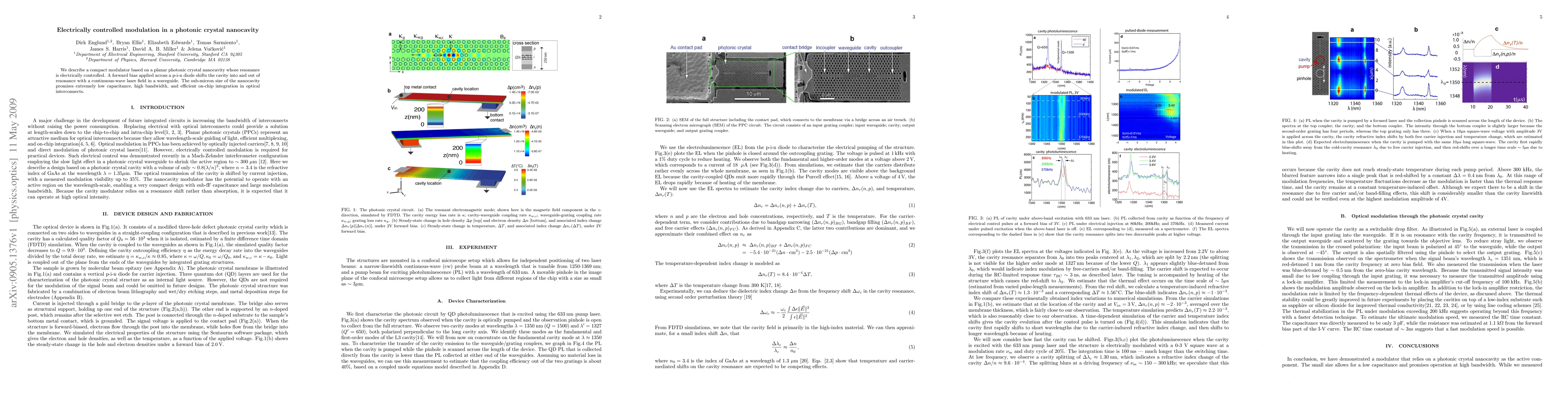 This paper details a compact electrically controlled modulator using a photonic crystal nanocavity. By applying a forward bias across a p-i-n diode, the resonance of the nanocavity is shifted, enabling modulation of a continuous-wave laser field for efficient on-chip optical interconnects.
