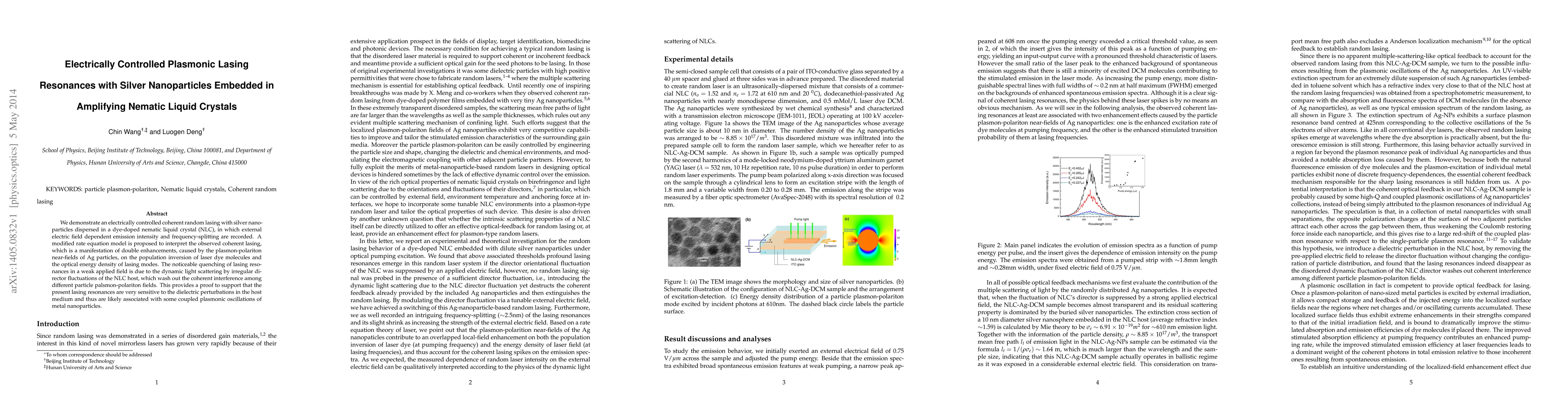 This paper demonstrates electrically controlled coherent random lasing using silver nanoparticles embedded in dye-doped nematic liquid crystals, showing frequency-splitting and intensity modulation under an electric field. The observed lasing phenomena are attributed to plasmon-polariton enhancements and are sensitive to dielectric perturbations in the host medium.