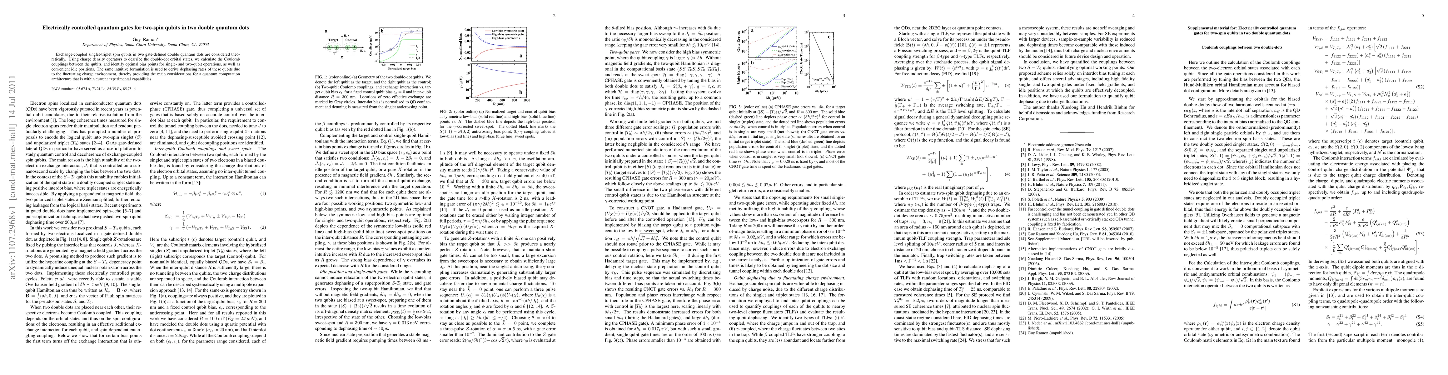 This paper theoretically investigates electrically controlled quantum gates for two-spin qubits in double quantum dots, identifying optimal bias points for single- and two-qubit operations and calculating dephasing rates due to fluctuating charge environments, which are crucial for designing a feasible quantum computation architecture.