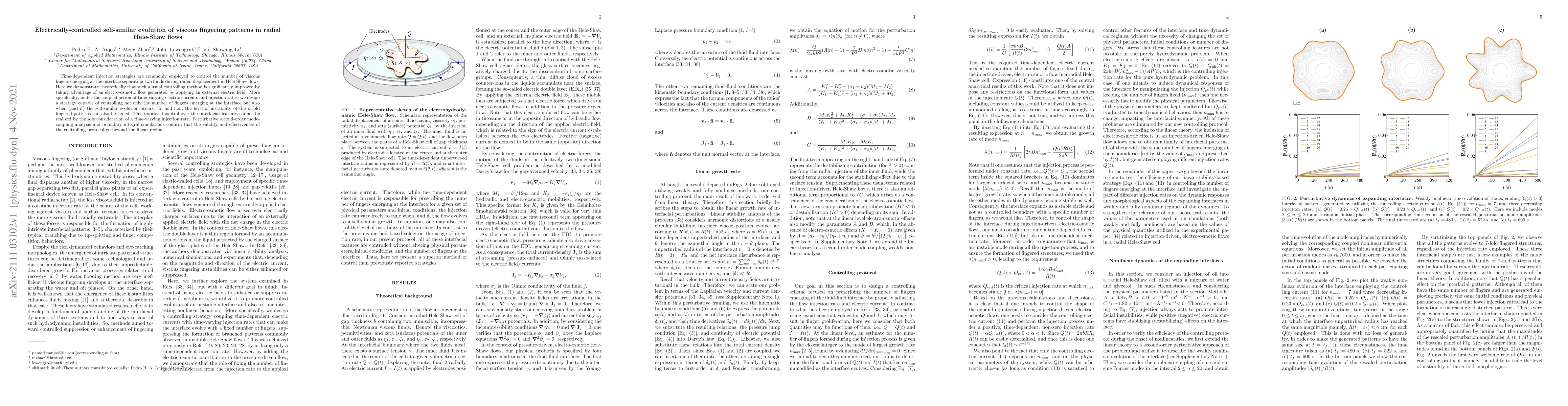 Time-dependent injection strategies are commonly employed to control the number of viscous fingers emerging at the interface separating two fluids during radial displacement in Hele-Shaw flows. Here we demonstrate theoretically that such a usual controlling method is significantly improved by taking advantage of an electro-osmotic flow generated by applying an external electric field. More specifically, under the coupled action of time-varying electric currents and injection rates, we design a strategy capable of controlling not only the number of fingers emerging at the interface but also when (and if) the self-similar evolution occurs. In addition, the level of instability of the $n$-fold fingered patterns can also be tuned. This improved control over the interfacial features cannot be realized by the sole consideration of a time-varying injection rate. Perturbative second-order mode-coupling analysis and boundary integral simulations confirm that the validity and effectiveness of the controlling protocol go beyond the linear regime.