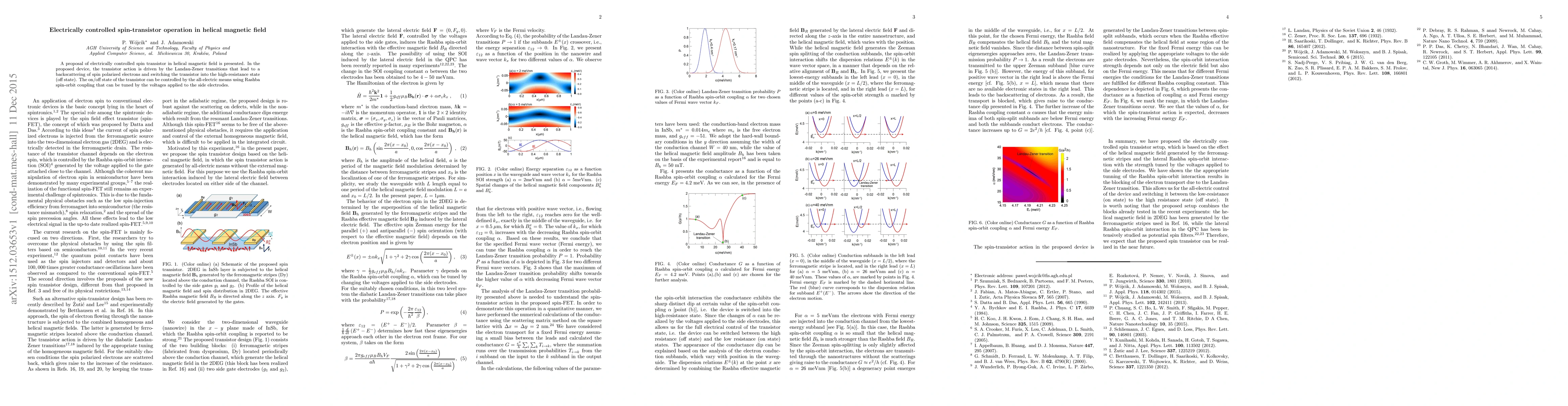 This paper proposes an electrically controlled spin transistor operating in a helical magnetic field, where the transistor's on/off state is switched via Landau-Zener transitions and controlled all-electrically using Rashba spin-orbit coupling tuned by side electrode voltages.