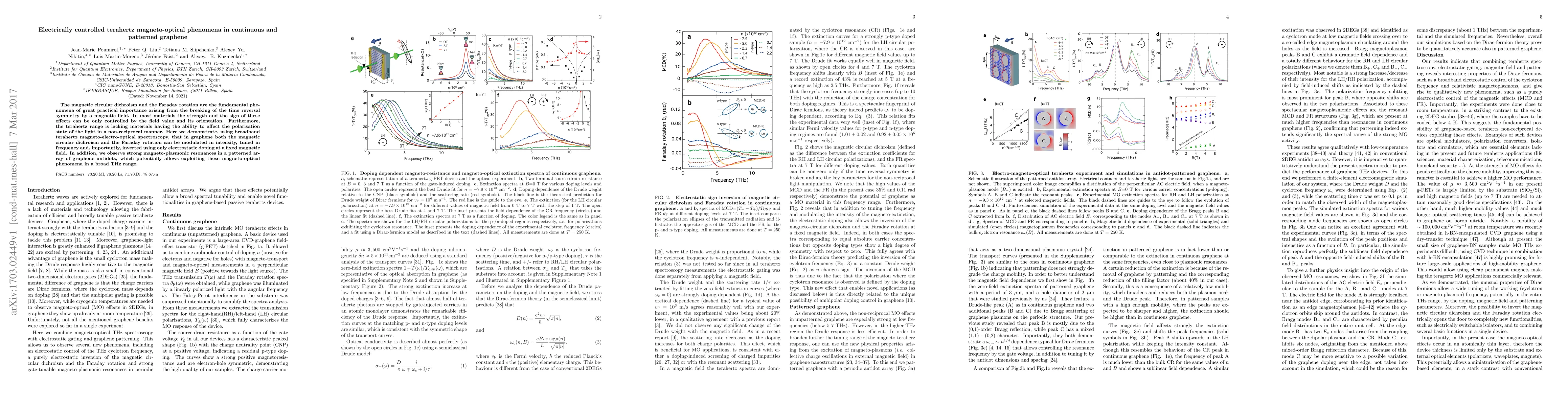 This paper demonstrates that electrically controlled terahertz magneto-optical phenomena in graphene can be modulated, tuned, and inverted via electrostatic doping, offering potential applications in the THz range. Additionally, patterned graphene antidots exhibit strong magneto-plasmonic resonances, enhancing the exploitation of magneto-optical effects.