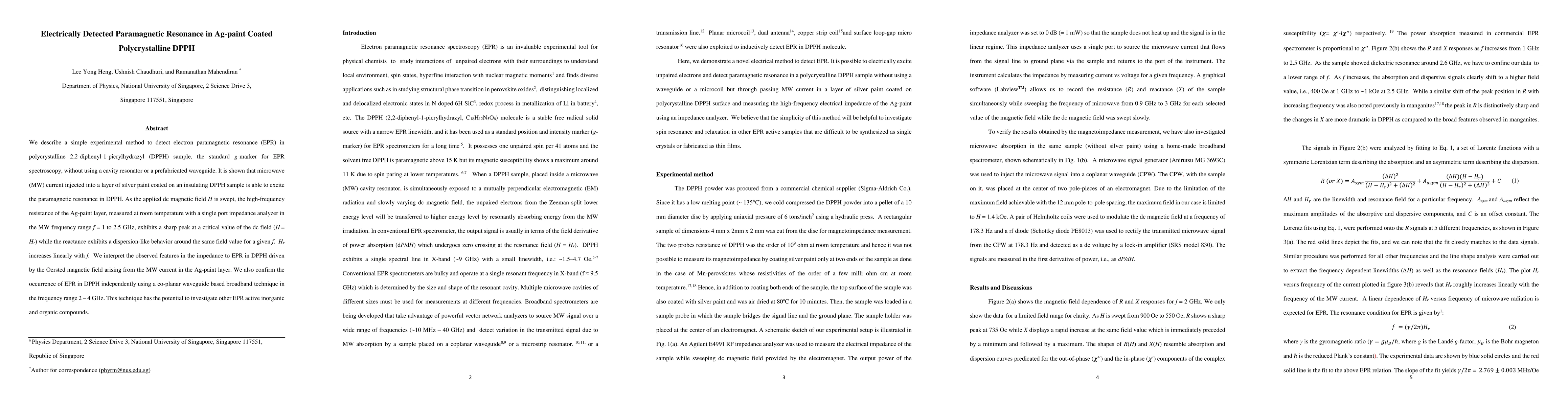This research introduces a straightforward method to detect electron paramagnetic resonance (EPR) in DPPH using microwave current injected into a silver paint layer, eliminating the need for cavity resonators or waveguides. The method's effectiveness is confirmed via an independent broadband technique, suggesting potential for studying other EPR-active compounds.