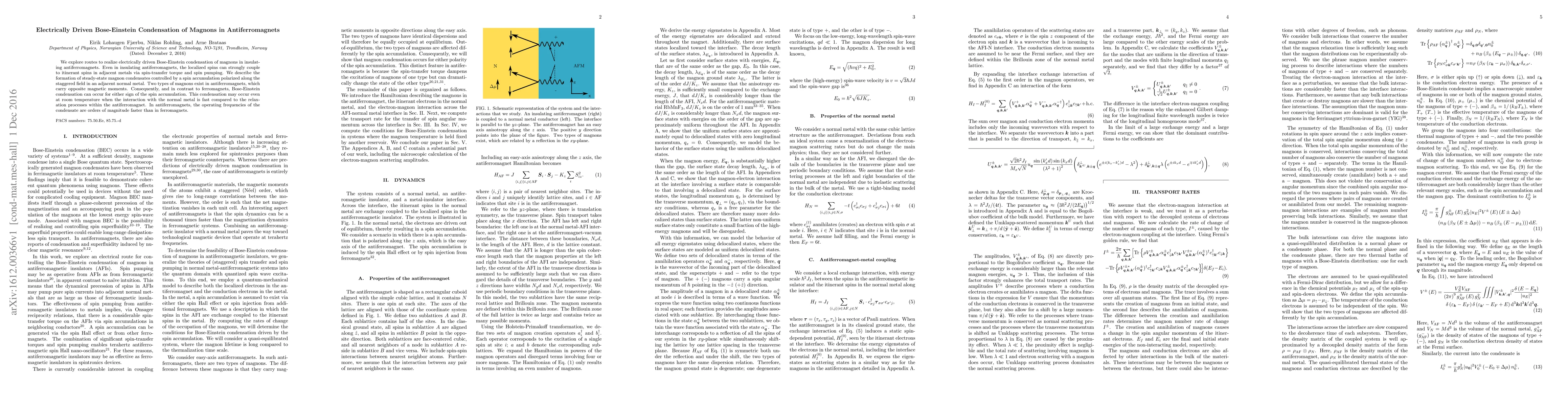 We explore routes to realize electrically driven Bose-Einstein condensation of magnons in insulating antiferromagnets. Even in insulating antiferromagnets, the localized spins can strongly couple to itinerant spins in adjacent metals via spin-transfer torque and spin pumping. We describe the formation of steady-state magnon condensates controlled by a spin accumulation polarized along the staggered field in an adjacent normal metal. Two types of magnons exist in antiferromagnets, which carry opposite magnetic moments. Consequently, and in contrast to ferromagnets, Bose-Einstein condensation can occur for either sign of the spin accumulation. This condensation may occur even at room temperature when the interaction with the normal metal is fast compared to the relaxation processes within the antiferromagnet. In antiferromagnets, the operating frequencies of the condensate are orders of magnitude faster than in ferromagnets.