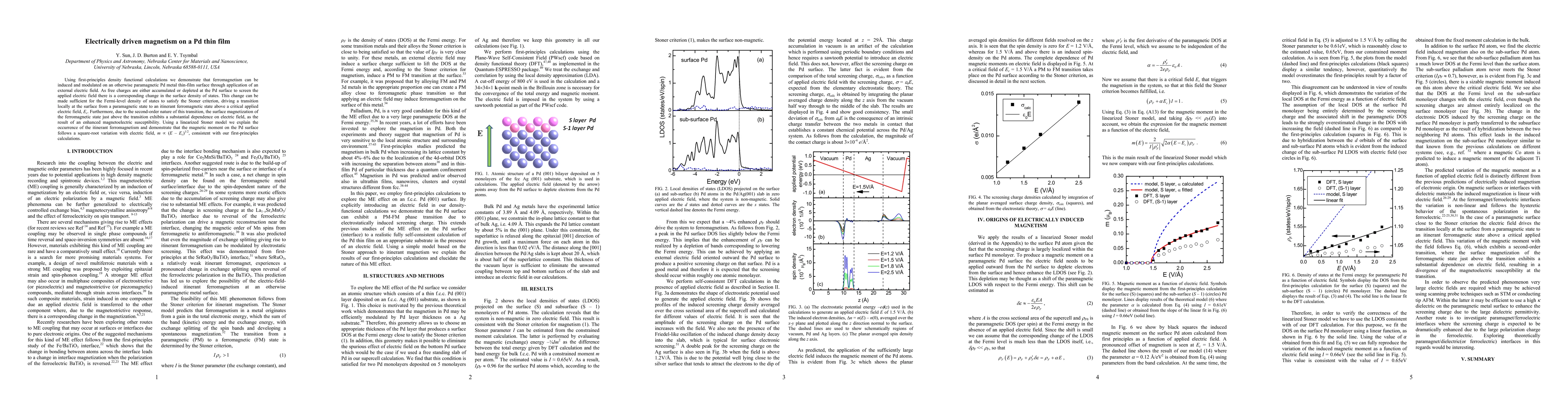 Researchers demonstrate that applying an electric field can induce magnetism in a normally paramagnetic Pd thin film, leading to a transition from paramagnetism to itinerant ferromagnetism with a critical applied electric field threshold.