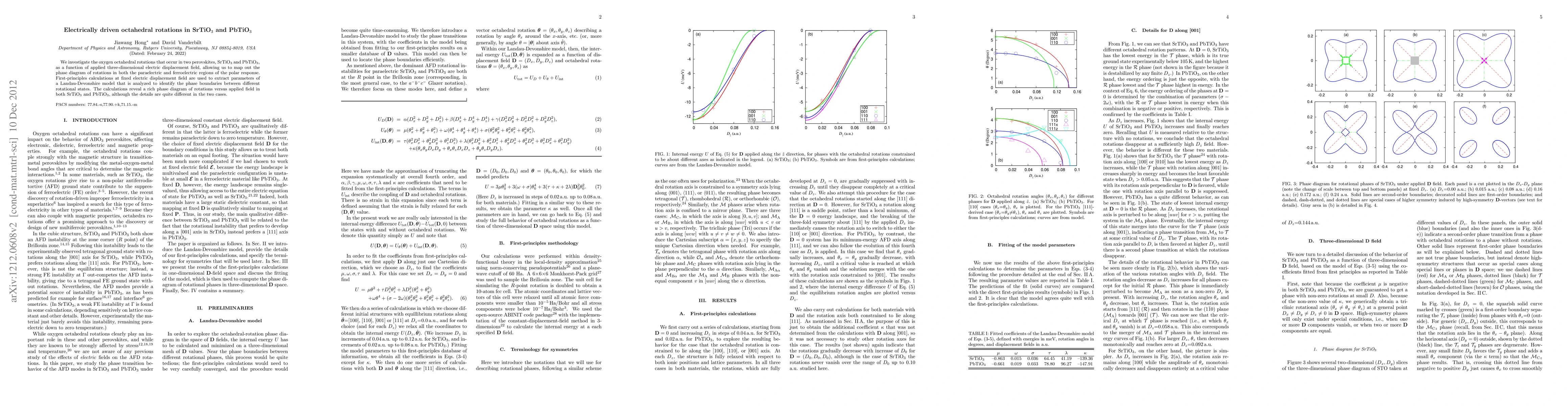 This study explores electrically induced octahedral rotations in SrTiO3 and PbTiO3 perovskites under applied electric fields, revealing distinct phase diagrams for each material. First-principles calculations inform a Landau-Devonshire model, identifying the phase boundaries between different rotational states in both paraelectric and ferroelectric regions.
