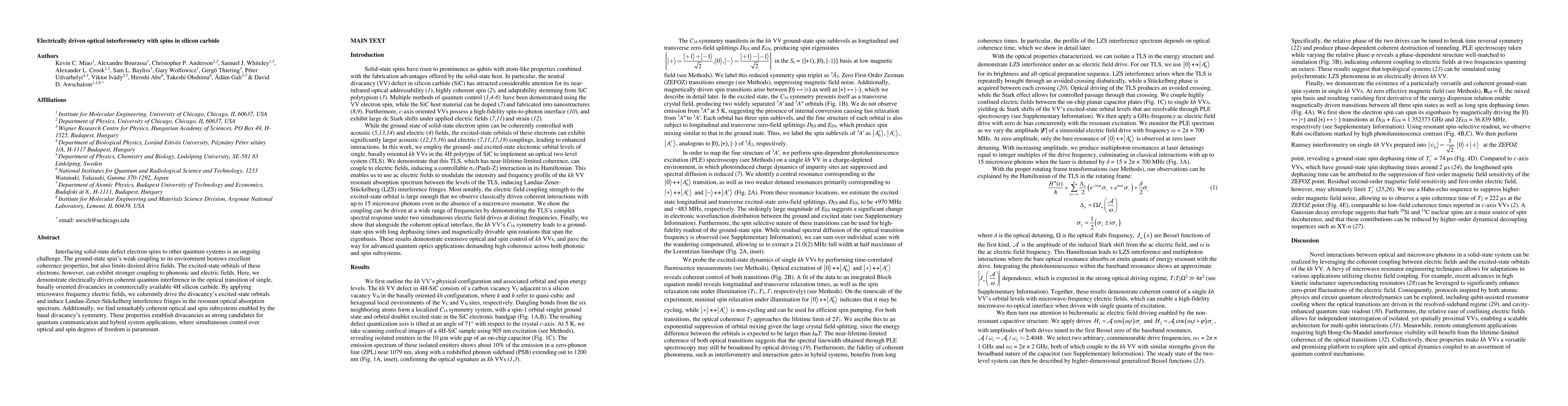 This study demonstrates electrically driven coherent quantum interference in the optical transitions of single divacancies in silicon carbide using microwave frequency fields. The findings show that the excited-state orbitals of defect electron spins can be driven effectively, inducing Landau-Zener-Stuckelberg interference, and establishing divacancies as promising candidates for quantum communication applications.