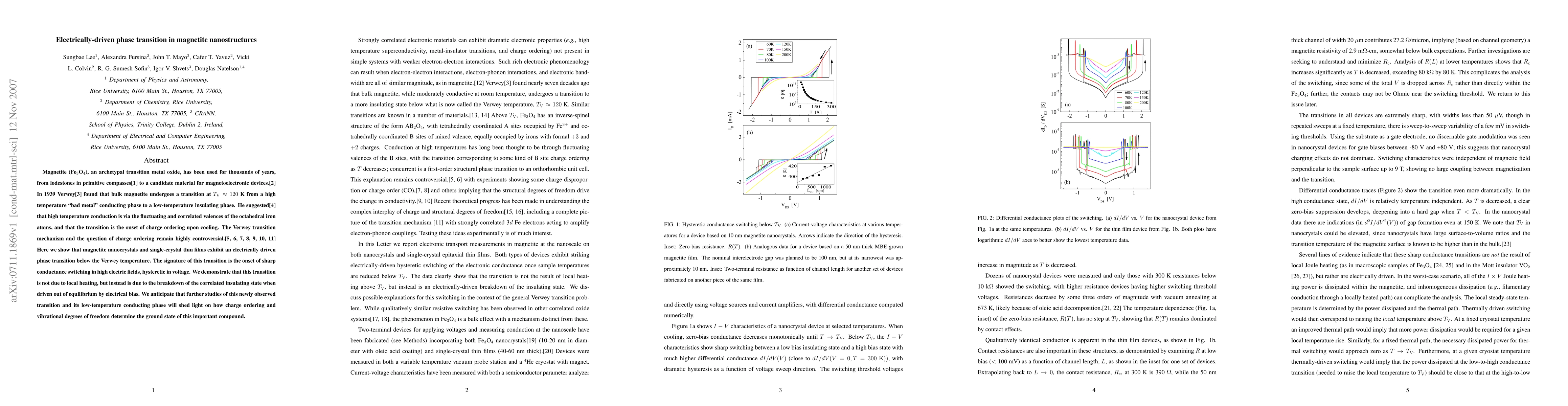 This paper demonstrates an electrically-driven phase transition in magnetite nanostructures below the Verwey temperature, characterized by sharp conductance switching in high electric fields. The transition is attributed to the breakdown of the correlated insulating state due to electrical bias, not local heating.