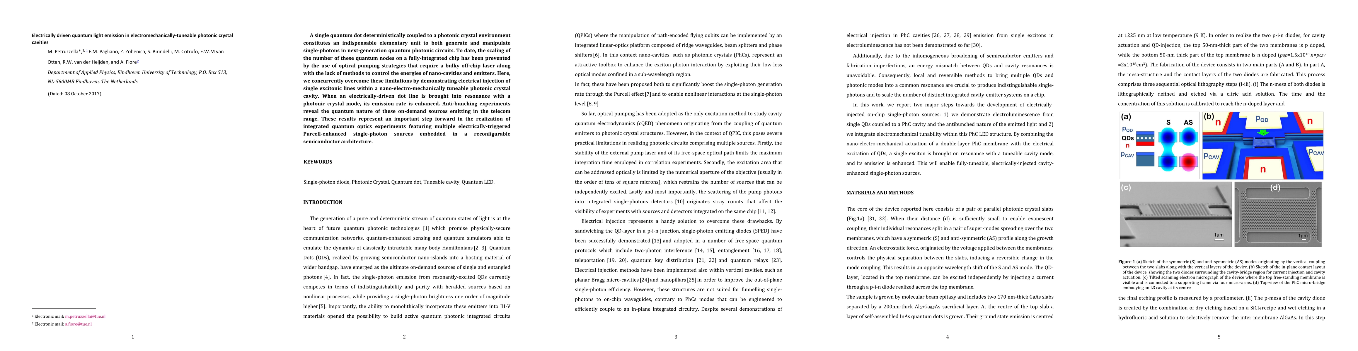 This paper demonstrates electrically driven quantum light emission from a quantum dot in a photonic crystal cavity, overcoming limitations of optical pumping and energy control. The electrically tunable system enables on-demand single-photon emission in the telecom range, paving the way for integrated quantum photonic circuits.