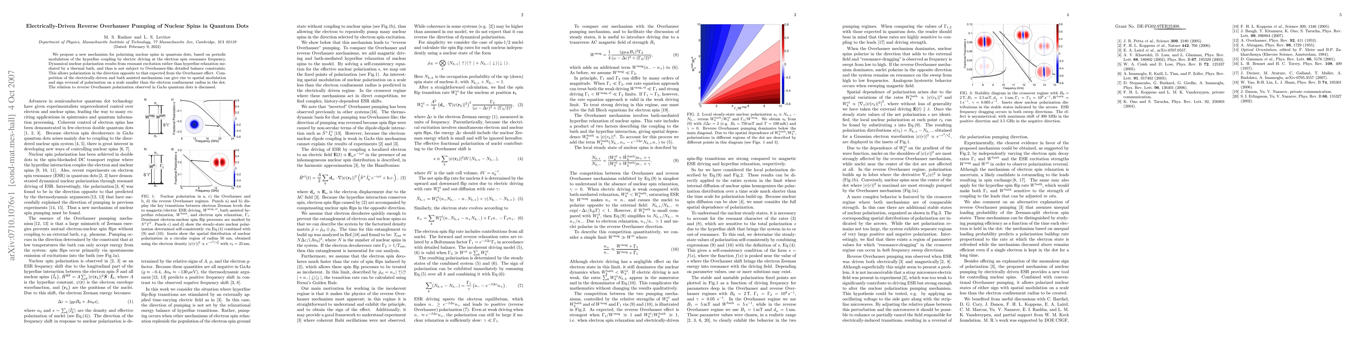 This paper proposes a novel method for polarizing nuclear spins in quantum dots using electrically-driven reverse Overhauser pumping, which avoids thermal bath constraints and allows for unexpected polarization directions. The method involves modulating hyperfine coupling via electric driving at electron spin resonance frequencies, leading to spatial modulation and sign reversal of polarization.