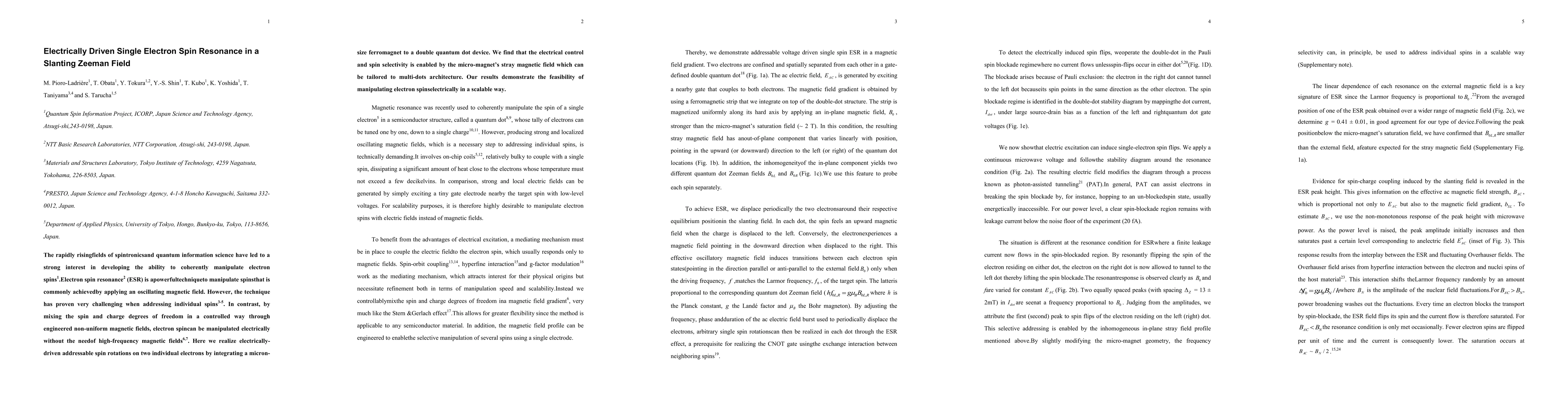 This paper demonstrates electrically driven single electron spin resonance in a double quantum dot device using a ferromagnet to manipulate electron spins without high-frequency magnetic fields. The study shows that the micro-magnet's stray field enables scalable electrical control and spin selectivity, paving the way for advancements in spintronics and quantum information science.