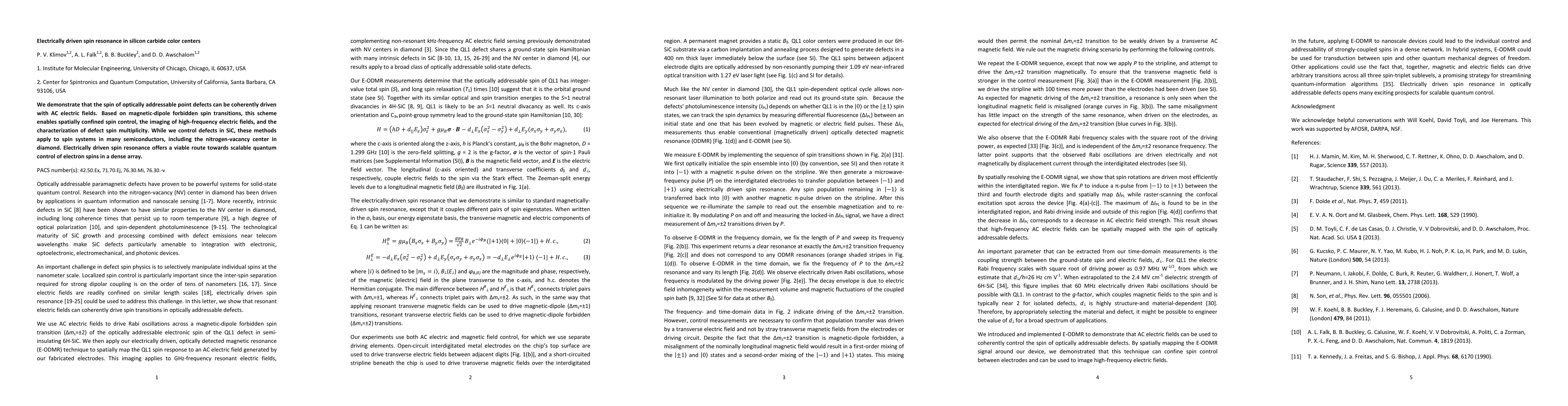 This study demonstrates coherent control of optically addressable point defect spins in silicon carbide using AC electric fields, facilitating spatially confined spin manipulation, electric field imaging, and spin multiplicity characterization, with potential for scalable quantum control in semiconductor spin systems.