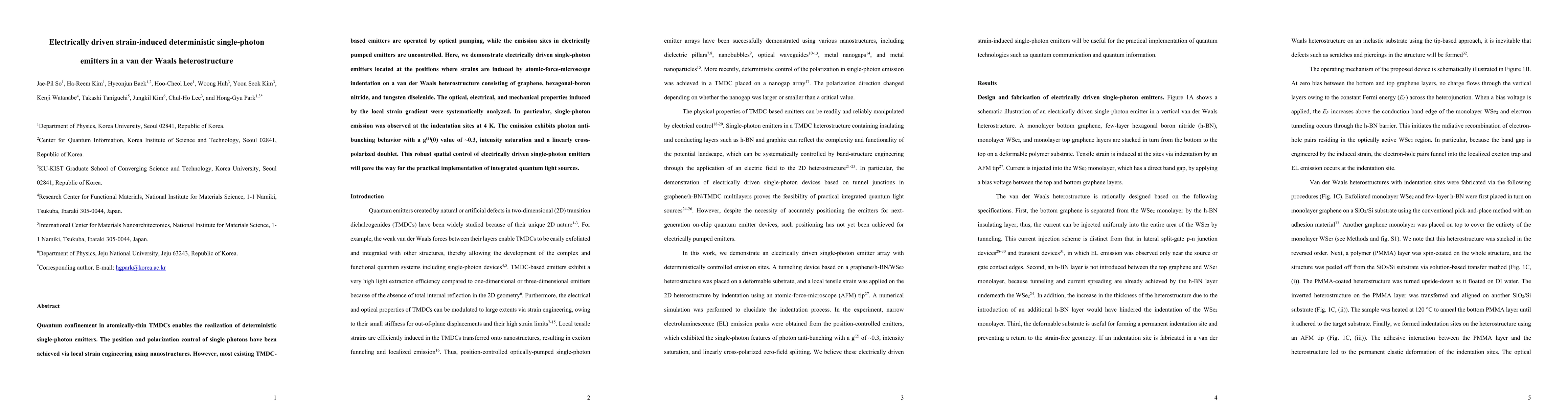This paper demonstrates electrically driven, deterministic single-photon emitters in a van der Waals heterostructure through controlled strain induced by atomic-force-microscope indentation. The study shows robust spatial control and photon anti-bunching behavior, paving the way for integrated quantum light sources.