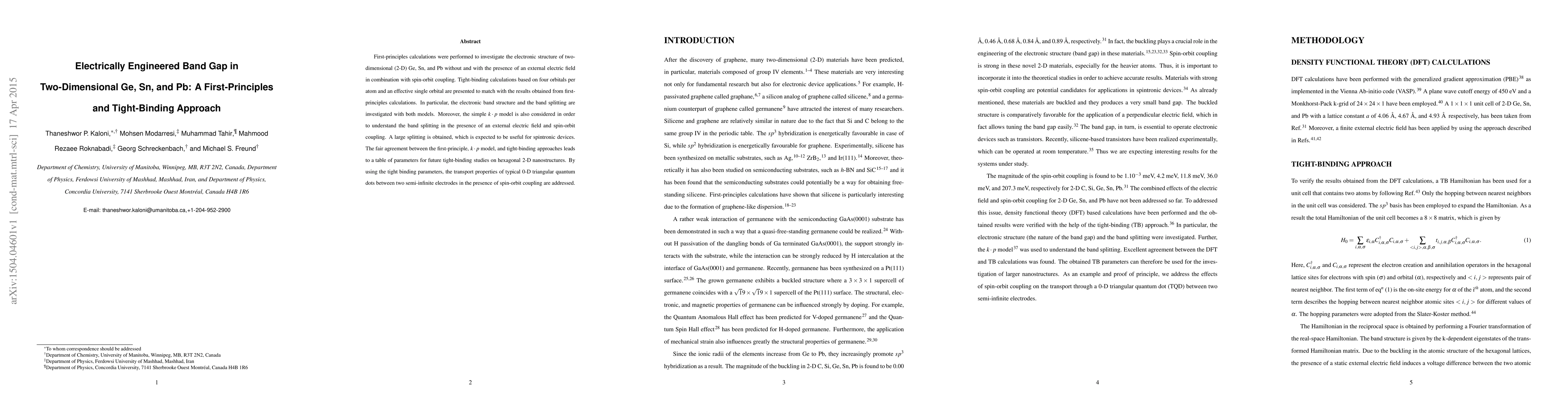 This paper investigates the electronic structure of 2-D Ge, Sn, and Pb under external electric fields using first-principles and tight-binding approaches, revealing significant band splitting useful for spintronic devices. The study also provides tight-binding parameters for future studies on hexagonal 2-D nanostructures and examines transport properties in quantum dots.