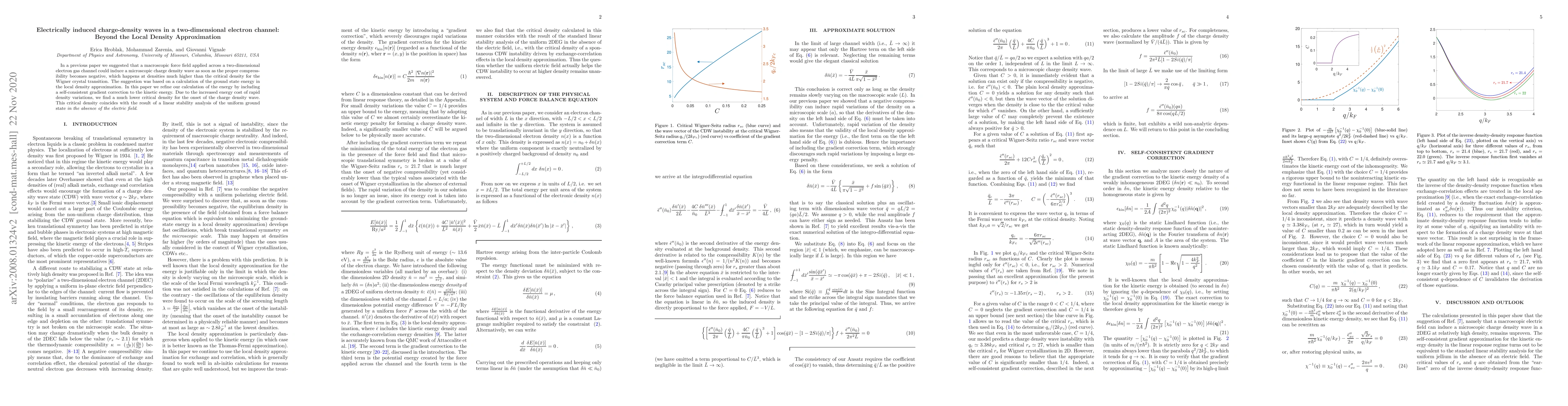 This paper refines the prediction of charge-density wave formation in a two-dimensional electron gas channel by incorporating a self-consistent gradient correction to kinetic energy, revealing a lower critical density for the wave's onset compared to previous local density approximation calculations. The refined critical density aligns with the results of a linear stability analysis without an electric field.