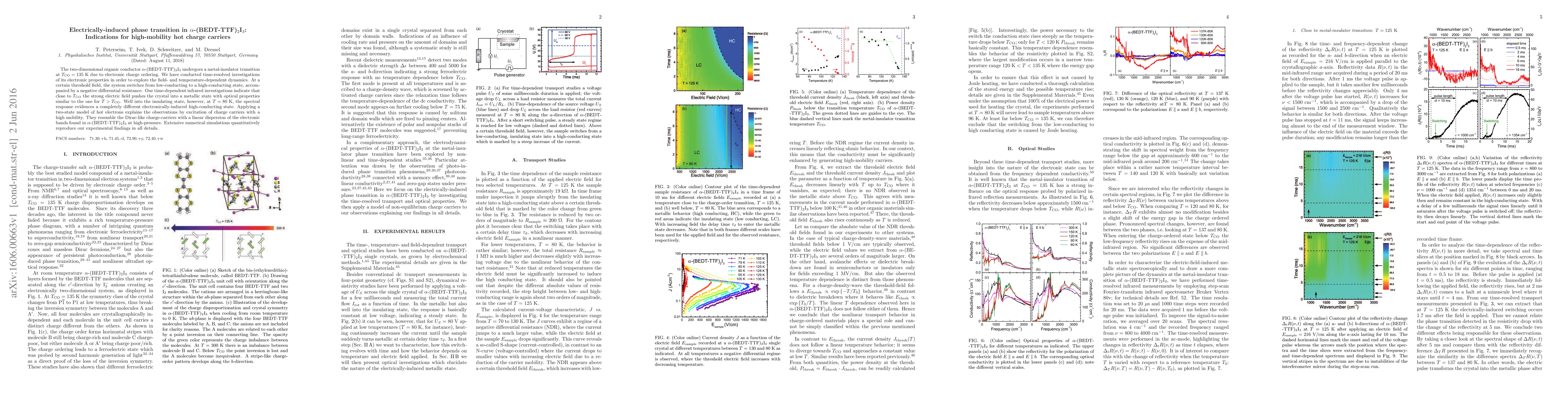 The paper investigates the metal-insulator transition in $\alpha$-(BEDT-TTF)$_2$I$_3$ and reveals that a strong electric field can induce a high-conducting state with high-mobility hot charge carriers, resembling Dirac-like carriers, particularly near the transition temperature. Numerical simulations confirm these findings.