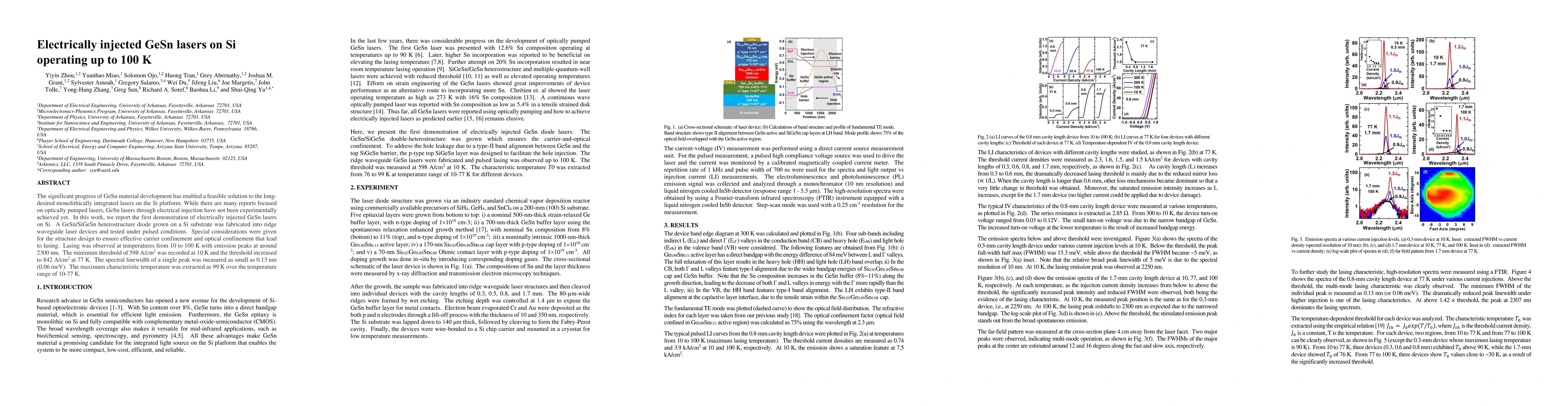 Researchers successfully demonstrated electrically injected GeSn lasers on Si, achieving lasing at temperatures up to 100 K with a minimum threshold of 598 A/cm2.