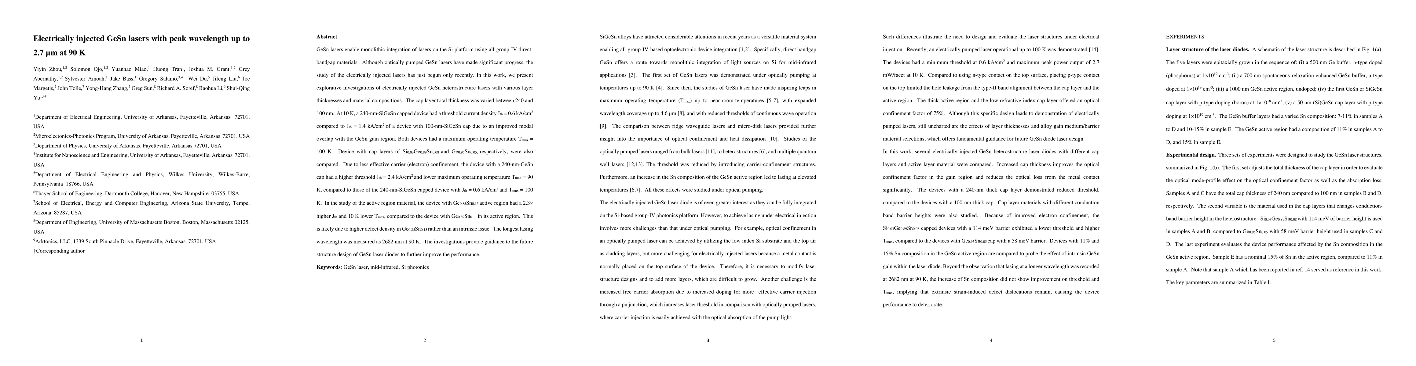 Researchers have successfully created electrically injected GeSn lasers with peak wavelengths up to 2.7 micrometers at 90K, offering a promising path for monolithic integration on the Si platform.