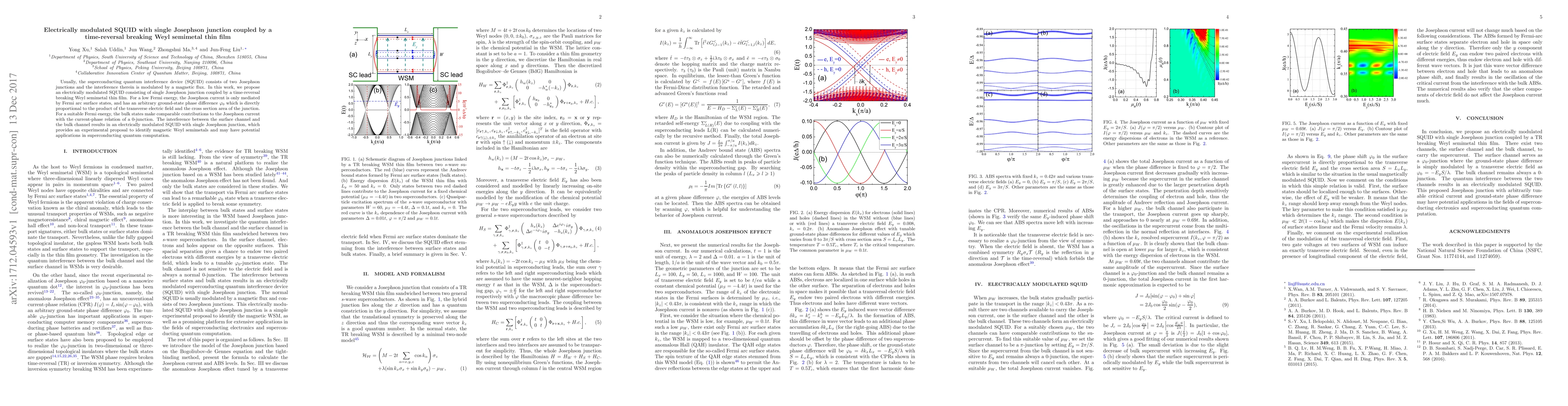 This paper proposes an electrically modulated SQUID using a single Josephson junction coupled with a time-reversal breaking Weyl semimetal thin film, enabling modulation via an electric field instead of a magnetic flux. The device's functionality depends on the Fermi energy, potentially identifying magnetic Weyl semimetals and offering applications in superconducting quantum computation.