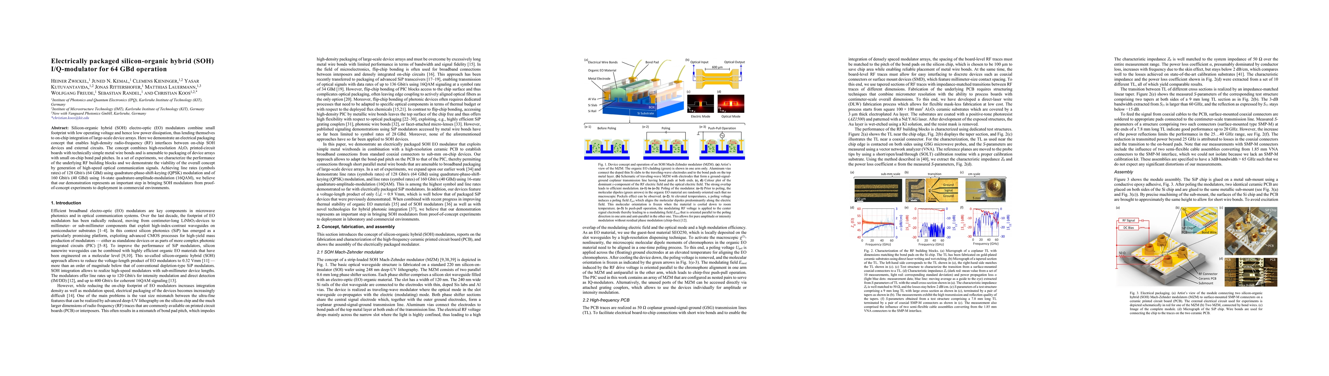 This paper presents an electrically packaged silicon-organic hybrid (SOH) I/Q-modulator for high-speed operation up to 64 GBd, achieving 128 Gbit/s using QPSK and 160 Gbit/s with 16QAM. The proposed packaging concept integrates high-density RF interfaces, combining Al2O3 printed-circuit boards and metal wire bonds for on-chip device arrays.