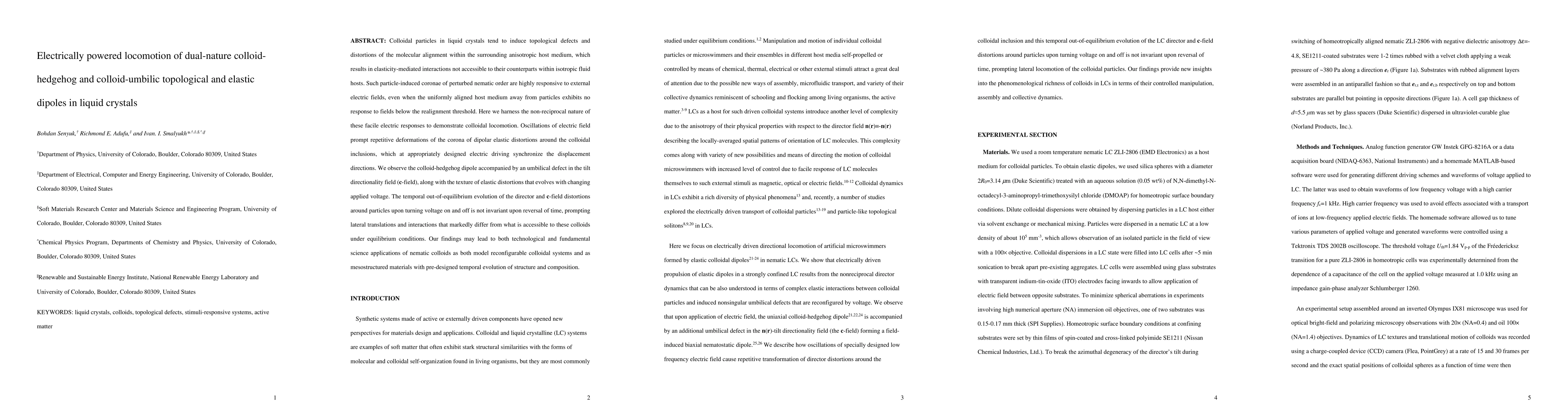 This paper investigates the electrically powered locomotion of unique colloidal particles in liquid crystals, demonstrating how their induced topological defects and elastic distortions respond to external electric fields. The study reveals that these particles can be driven to move laterally by oscillating electric fields, showcasing potential applications in reconfigurable colloidal systems and mesostructured materials.