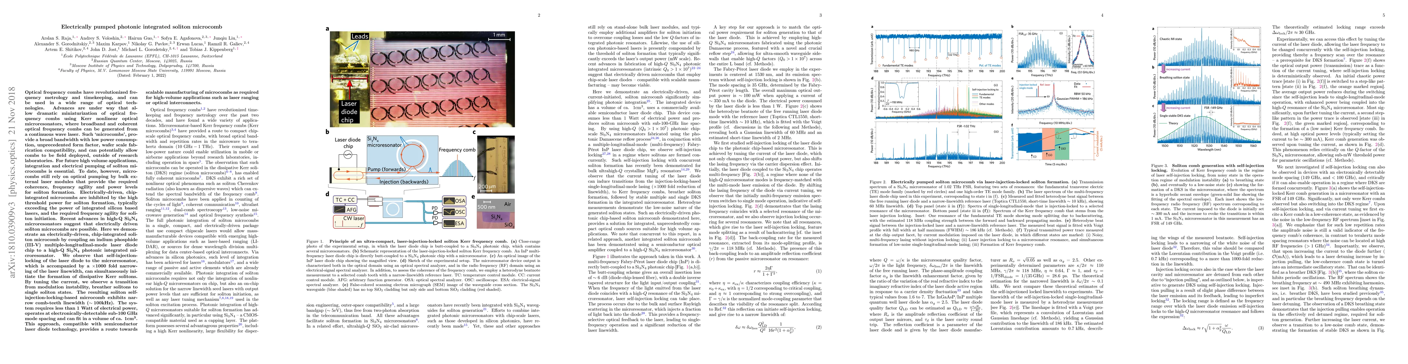 This paper demonstrates the creation of an electrically-pumped, chip-integrated soliton microcomb by coupling an indium phosphide laser diode to a high-Q Si3N4 microresonator, achieving dissipative Kerr solitons and transitioning between different soliton states with less than 1 Watt of power. The microcomb offers a broad bandwidth and fits in a compact 1cm3 volume.