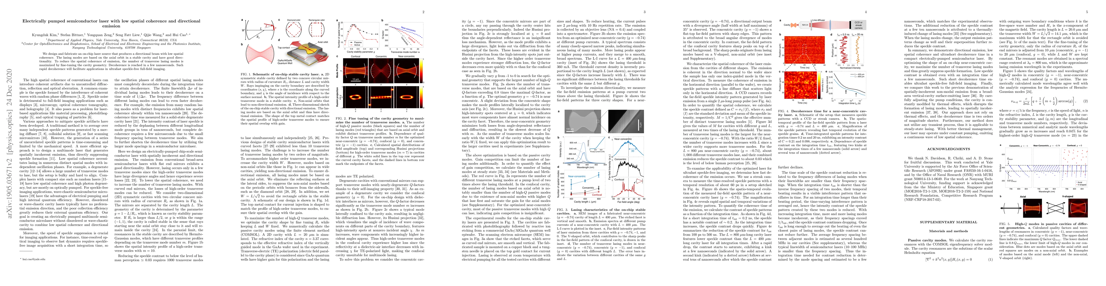 We design and fabricate an on-chip laser source that produces a directional beam with low spatial coherence. The lasing modes are based on the axial orbit in a stable cavity and have good directionality. To reduce the spatial coherence of emission, the number of transverse lasing modes is maximized by fine-tuning the cavity geometry. Decoherence is reached in a few nanoseconds. Such rapid decoherence will facilitate applications in ultrafast speckle-free full-field imaging.