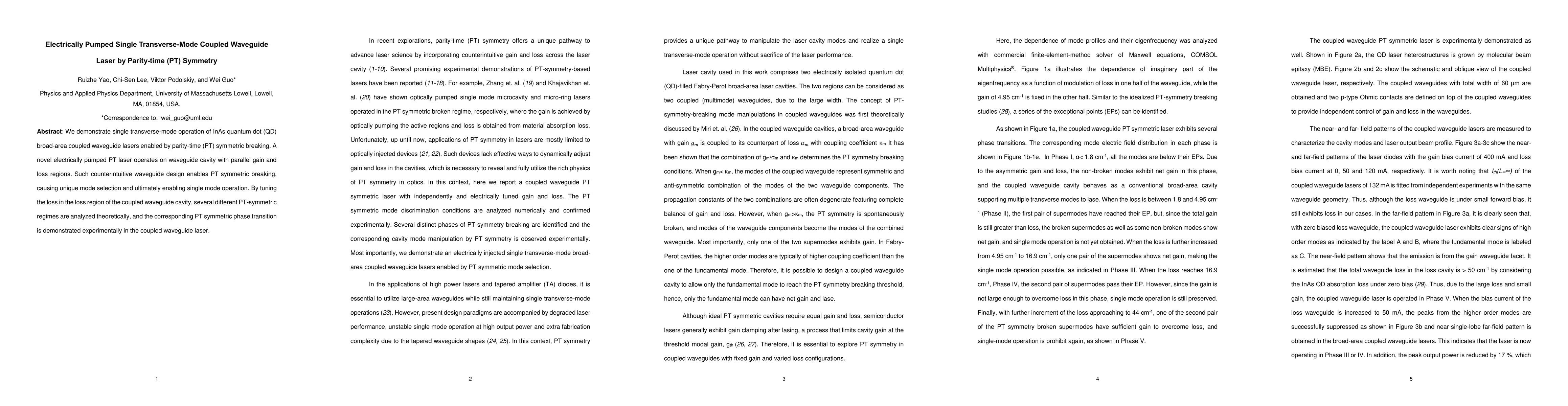 This paper demonstrates electrically pumped single transverse-mode operation in broad-area coupled waveguide lasers enabled by parity-time symmetry. The design allows for unique mode selection and single mode operation through electrically tunable gain and loss, with experimental validation of the PT symmetric phase transition.
