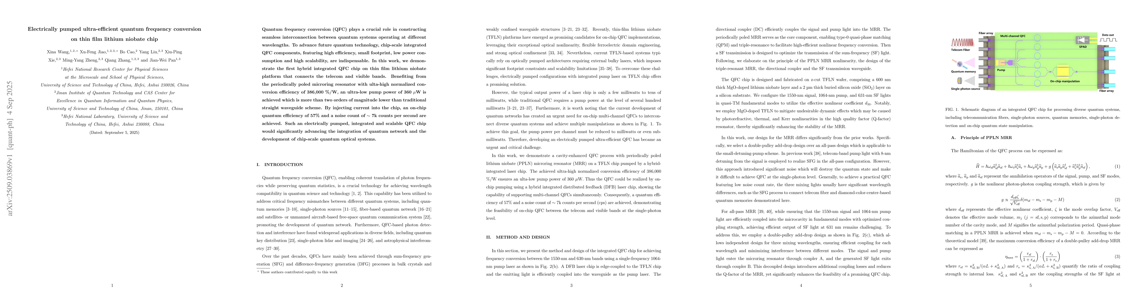 Quantum frequency conversion (QFC) plays a crucial role in constructing seamless interconnection between quantum systems operating at different wavelengths. To advance future quantum technology, chip-scale integrated QFC components, featuring high efficiency, small footprint, low power consumption and high scalability, are indispensable. In this work, we demonstrate the first hybrid integrated QFC chip on thin film lithium niobate platform that connects the telecom and visible bands. Benefiting from the periodically poled microring resonator with ulta-high normalized conversion efficiency of 386,000 %/W, an ultra-low pump power of 360 {\mu}W is achieved which is more than two orders of magnitude lower than traditional straight waveguide scheme. By injecting current into the chip, an on-chip quantum efficiency of 57% and a noise count of ~ 7k counts per second are achieved. Such an electrically pumped, integrated and scalable QFC chip would significantly advancing the integration of quantum network and the development of chip-scale quantum optical systems.