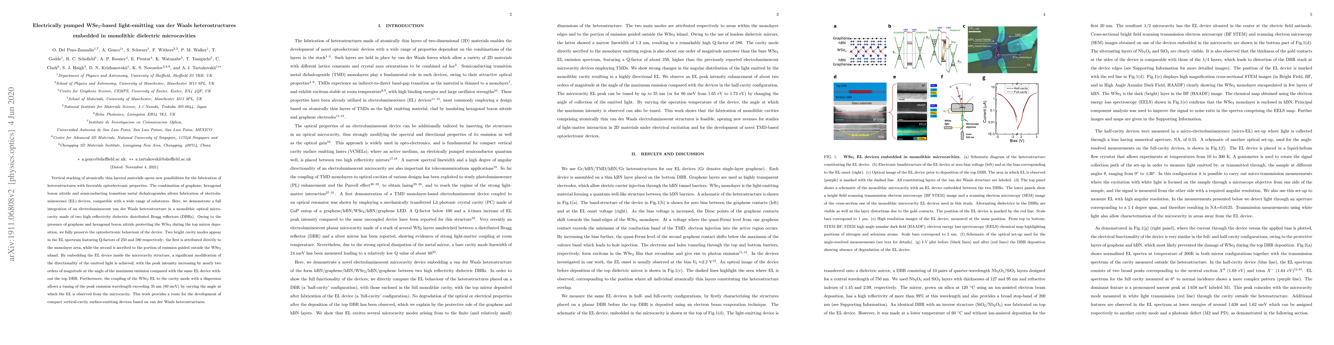 Vertical stacking of atomically thin layered materials opens new possibilities for the fabrication of heterostructures with favorable optoelectronic properties. The combination of graphene, hexagonal boron nitride and semiconducting transition metal dichalcogenides allows fabrication of electroluminescence (EL) devices, compatible with a wide range of substrates. Here, we demonstrate a full integration of an electroluminescent van der Waals heterostructure in a monolithic optical microcavity made of two high reflectivity dielectric distributed Bragg reflectors (DBRs). Owing to the presence of graphene and hexagonal boron nitride protecting the WSe$_2$ during the top mirror deposition, we fully preserve the optoelectronic behaviour of the device. Two bright cavity modes appear in the EL spectrum featuring Q-factors of 250 and 580 respectively: the first is attributed directly to the monolayer area, while the second is ascribed to the portion of emission guided outside the WSe$_2$ island. By embedding the EL device inside the microcavity structure, a significant modification of the directionality of the emitted light is achieved, with the peak intensity increasing by nearly two orders of magnitude at the angle of the maximum emission compared with the same EL device without the top DBR. Furthermore, the coupling of the WSe$_2$ EL to the cavity mode with a dispersion allows a tuning of the peak emission wavelength exceeding 35 nm (80 meV) by varying the angle at which the EL is observed from the microcavity. This work provides a route for the development of compact vertical-cavity surface-emitting devices based on van der Waals heterostructures.