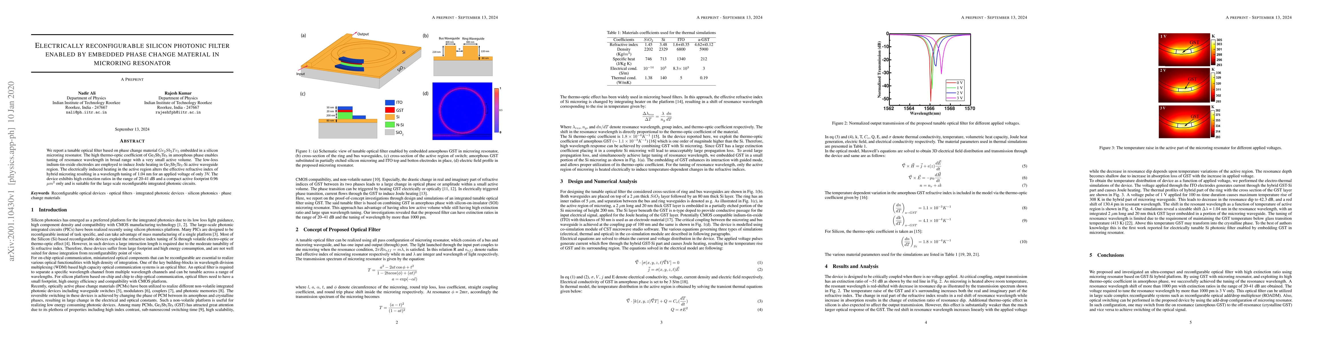 This paper presents a tunable silicon photonic filter using a phase change material embedded in a microring resonator, enabling electrical tuning via Joule heating. The device achieves a wavelength tuning of 1.04 nm with an applied voltage of 3V, demonstrating high extinction ratios and a compact footprint suitable for large-scale integrated photonic circuits.