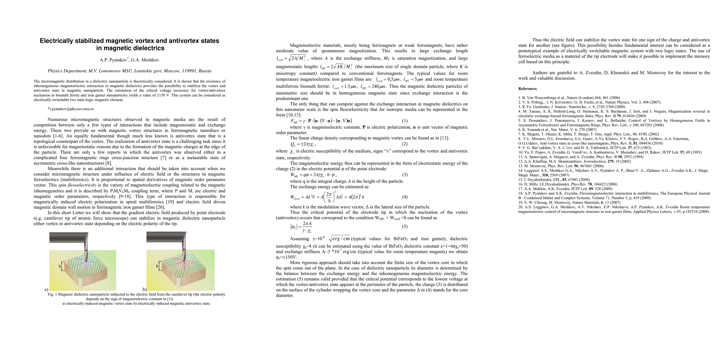 Summary: The paper explores the stabilization of magnetic vortex and antivortex states in dielectric nanoparticles through inhomogeneous magnetoelectric interactions, estimating a critical voltage of +/-150 V for their nucleation, thus presenting a potential electrically switchable two-state logic element.