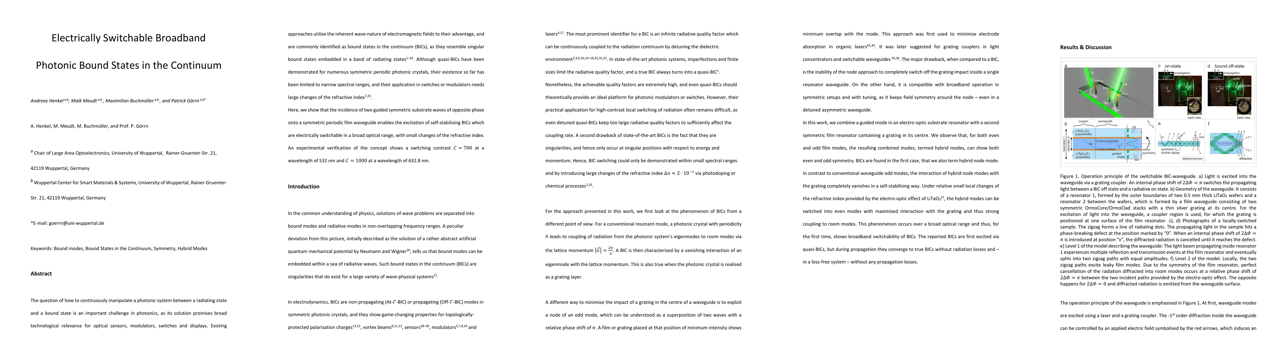 This research introduces an electrically switchable broadband photonic system based on self-stabilising bound states in the continuum (BICs) in a symmetric periodic film waveguide. The system demonstrates significant switching contrast over a wide optical range using minimal refractive index changes.