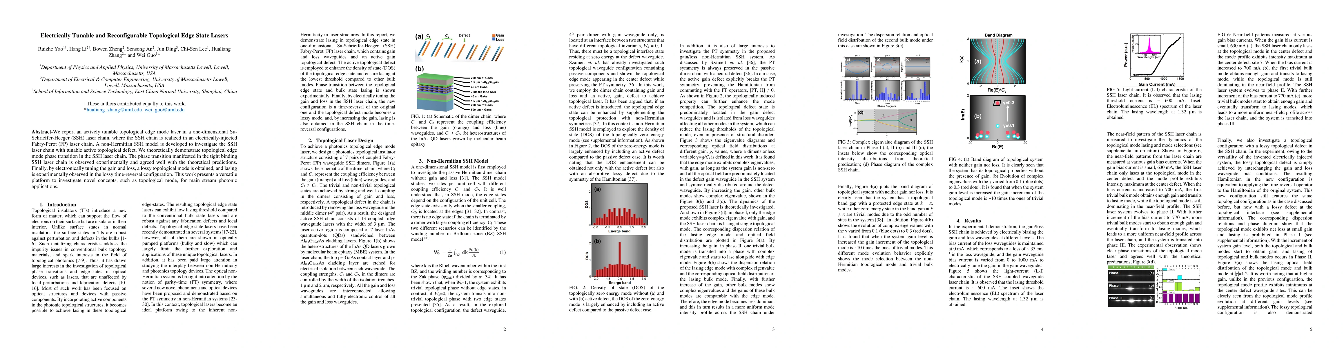 This paper reports on a tunable topological edge mode laser in a one-dimensional SSH laser chain realized in an electrically-injected Fabry-Perot laser chain. The study demonstrates experimentally observed topological edge mode phase transition and lasing in a lossy topological mode, presenting a versatile platform for photonic applications.