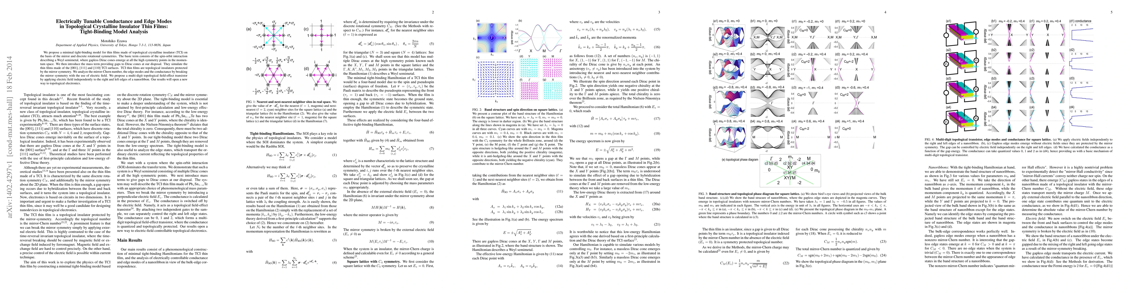 This paper proposes a tight-binding model for topological crystalline insulator thin films, analyzing how electrical fields can tune conductance and edge modes. The model demonstrates potential for creating multi-digit topological field-effect transistors, paving the way for advancements in topological electronics.