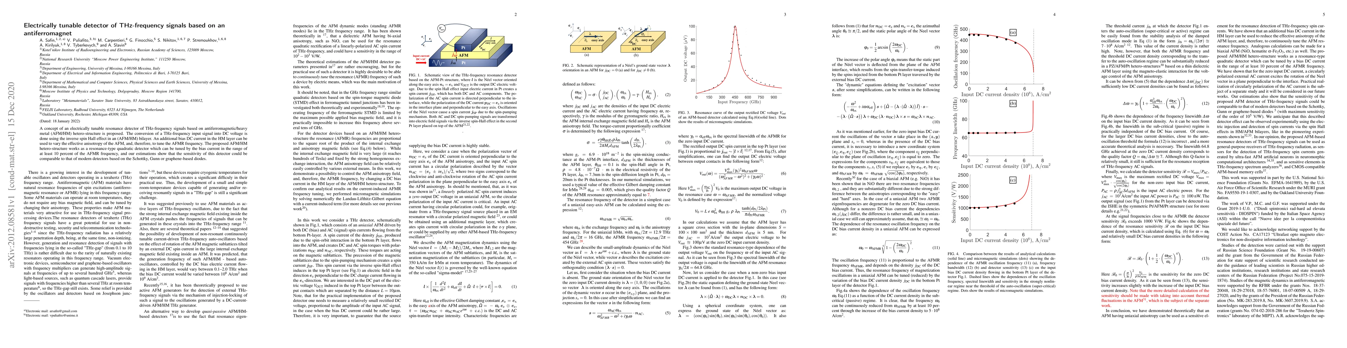A concept of an electrically tunable resonance detector of THz-frequency signals based on antiferromagnetic/heavy metal (AFM/HM) hetero-structure is proposed. The conversion of a THz-frequency input signal into DC voltage is done using the inverse spin Hall effect in an (AFM/HM) bilayer. An additional bias DC current in the HM layer can be used to vary the effective anisotropy of the AFM, and, therefore, to tune the AFMR frequency. The proposed AFM/HM hetero-structure works as a resonance-type quadratic detector which can be tuned by the bias current in the range of at least 10 percent of the AFMR frequency and our estimations show that the sensitivity of this detector could be comparable to that of modern detectors based on the Schottky, Gunn or graphene-based diodes.