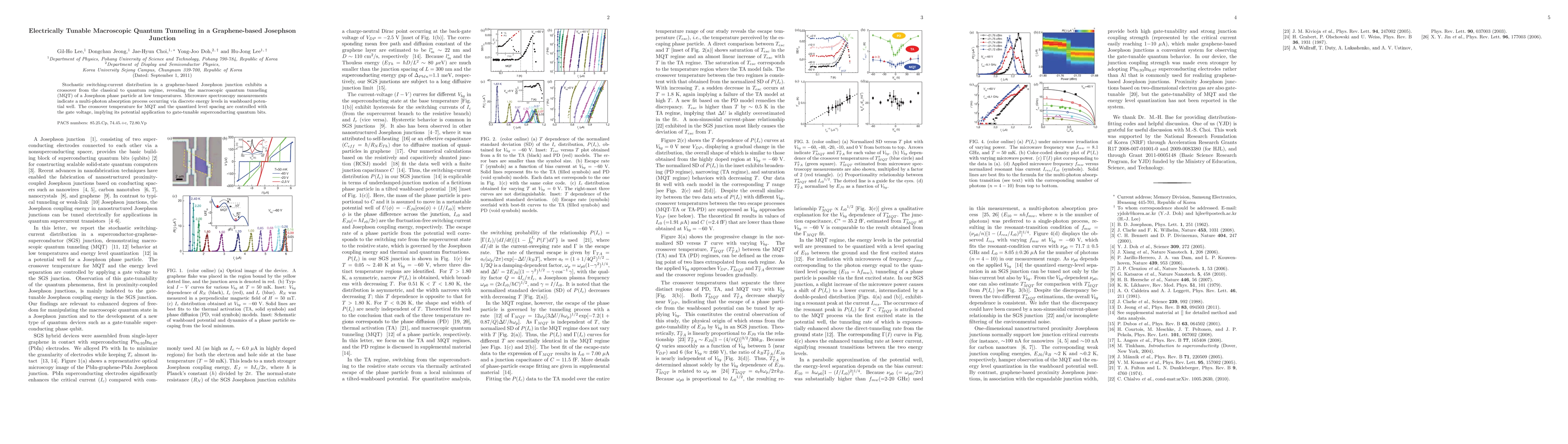 This paper investigates macroscopic quantum tunneling in a graphene-based Josephson junction, revealing a transition from classical to quantum behavior at low temperatures. The study shows that the crossover temperature and quantized energy levels can be tuned via gate voltage, suggesting applications for gate-tunable superconducting qubits.