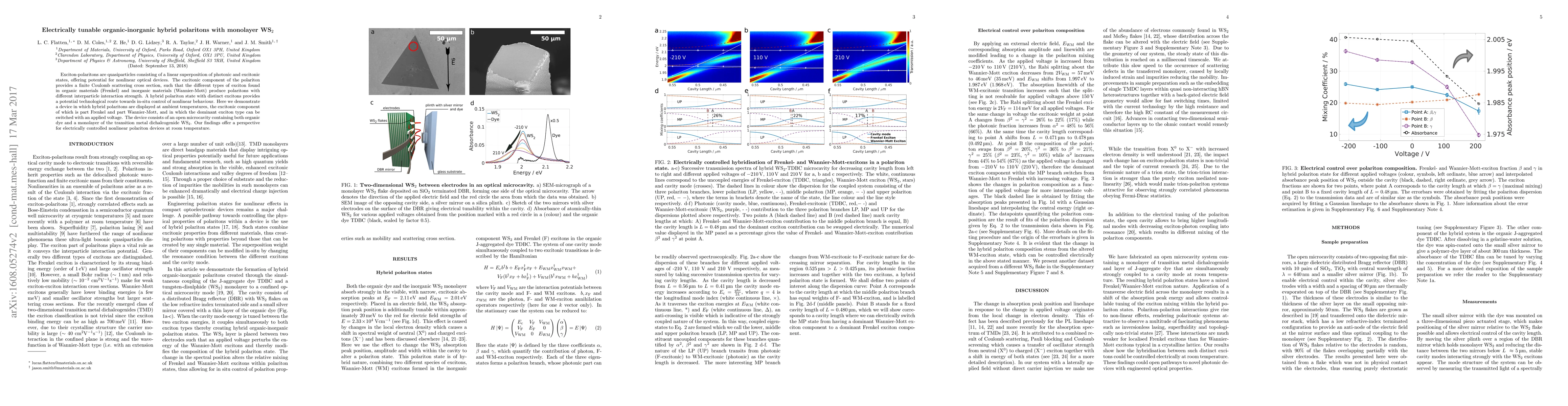 Exciton-polaritons are quasiparticles consisting of a linear superposition of photonic and excitonic states, offering potential for nonlinear optical devices. The excitonic component of the polariton provides a finite Coulomb scattering cross section, such that the different types of exciton found in organic materials (Frenkel) and inorganic materials (Wannier-Mott) produce polaritons with different interparticle interaction strength. A hybrid polariton state with distinct excitons provides a potential technological route towards in-situ control of nonlinear behaviour. Here we demonstrate a device in which hybrid polaritons are displayed at ambient temperatures, the excitonic component of which is part Frenkel and part Wannier-Mott, and in which the dominant exciton type can be switched with an applied voltage. The device consists of an open microcavity containing both organic dye and a monolayer of the transition metal dichalcogenide WS$_2$. Our findings offer a perspective for electrically controlled nonlinear polariton devices at room temperature.