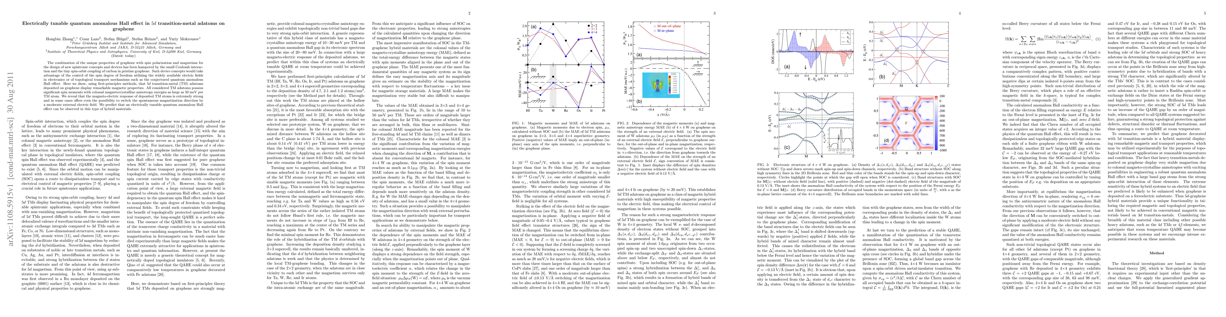This study demonstrates that 5d transition-metal adatoms on graphene exhibit strong magnetic properties and significant spin moments, enabling electrically tunable quantum anomalous Hall effect due to substantial magnetocrystalline anisotropy and strong magneto-electric response. This discovery opens new avenues for spintronic devices utilizing topological transport mechanisms.
