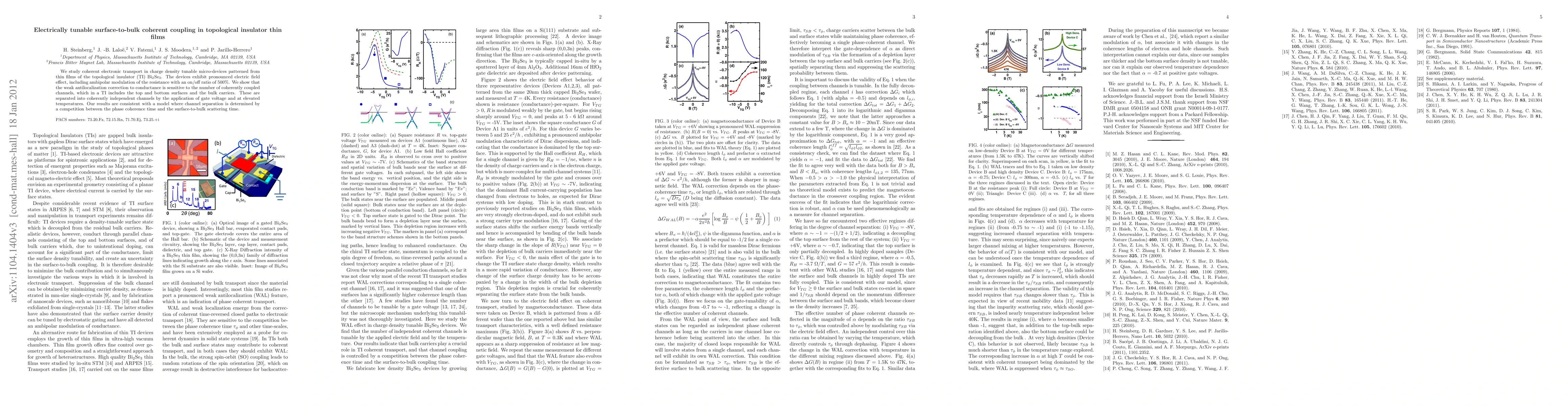 This research explores electrically tunable coherent coupling in topological insulator thin films, demonstrating significant electric field effects on resistance modulation and revealing that the weak antilocalization correction in conductance is influenced by the number of coherently coupled surface and bulk channels, which can be independently controlled by gate voltage.