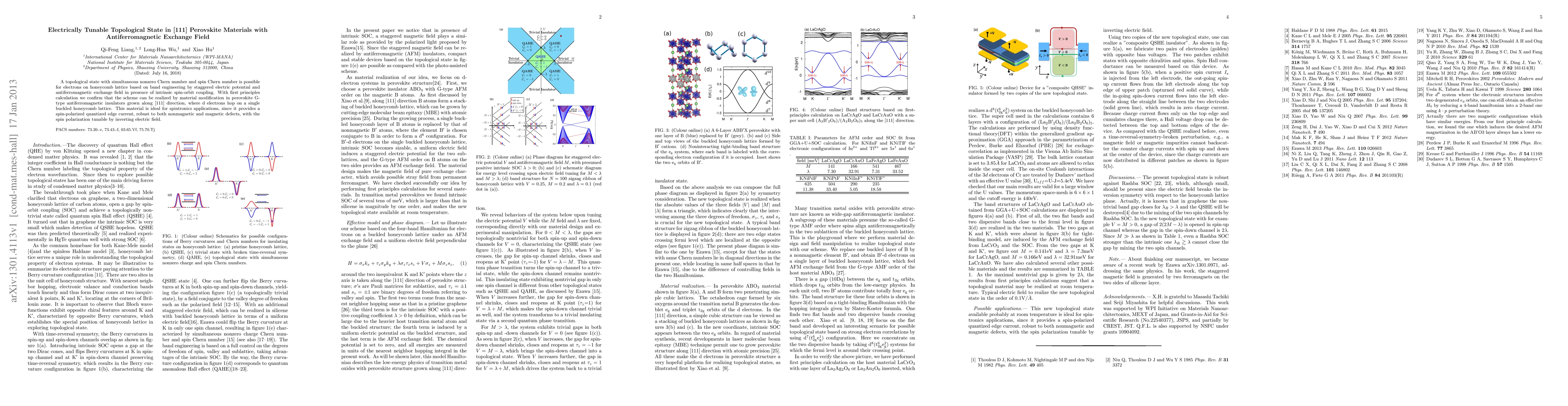 A topological state with simultaneous nonzero Chern number and spin Chern number is possible for electrons on honeycomb lattice based on band engineering by staggered electric potential and antiferromagnetic exchange field in presence of intrinsic spin-orbit coupling. With first principles calculation we confirm that the scheme can be realized by material modification in perovskite G-type antiferromagnetic insulators grown along [111] direction, where d electrons hop on a single buckled honeycomb lattice. This material is ideal for spintronics applications, since it provides a spin-polarized quantized edge current, robust to both nonmagnetic and magnetic defects, with the spin polarization tunable by inverting electric field.