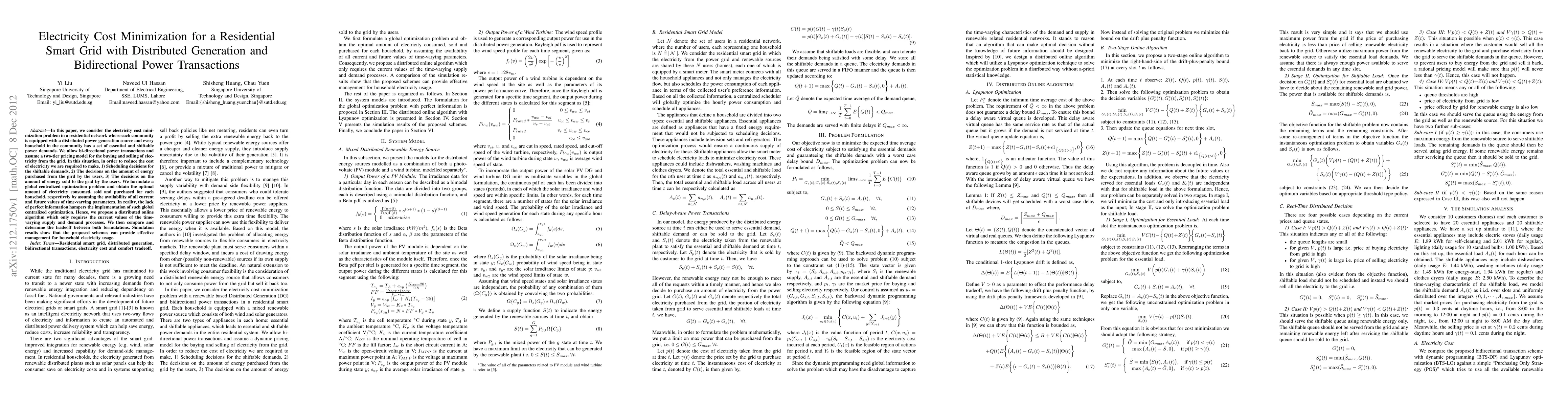 A study investigates ways to minimize electricity costs for households in smart grids with distributed generation and bidirectional power transactions. It compares two approaches: a global centralized optimization method and a distributed online algorithm using only current values of time-varying parameters.