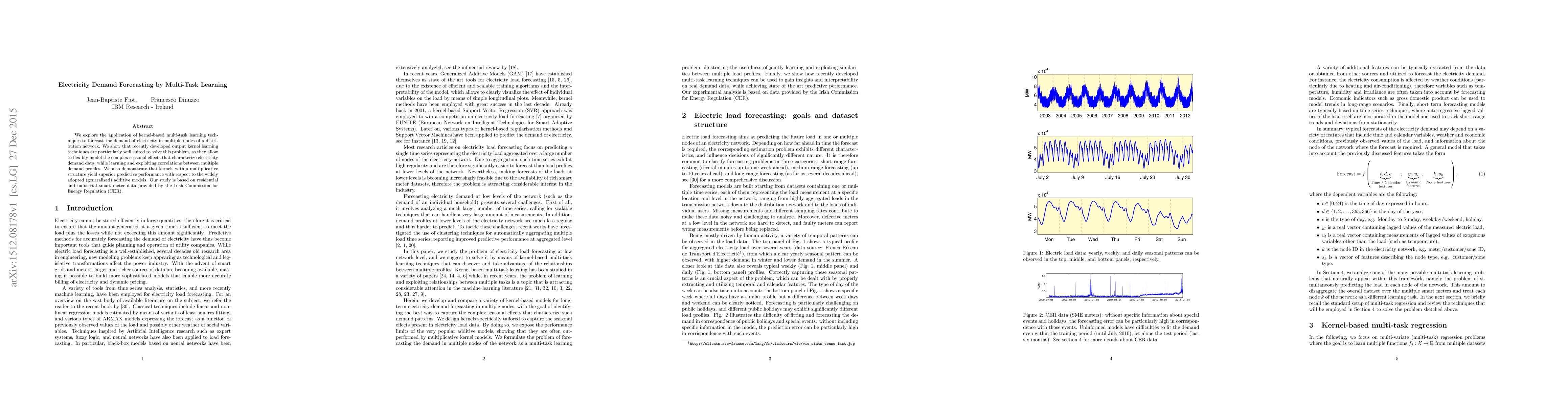 This paper applies kernel-based multi-task learning to forecast electricity demand across multiple nodes in a distribution network, demonstrating superior performance over generalized additive models. The study leverages smart meter data from Ireland to model complex seasonal effects and exploit correlations between demand profiles.
